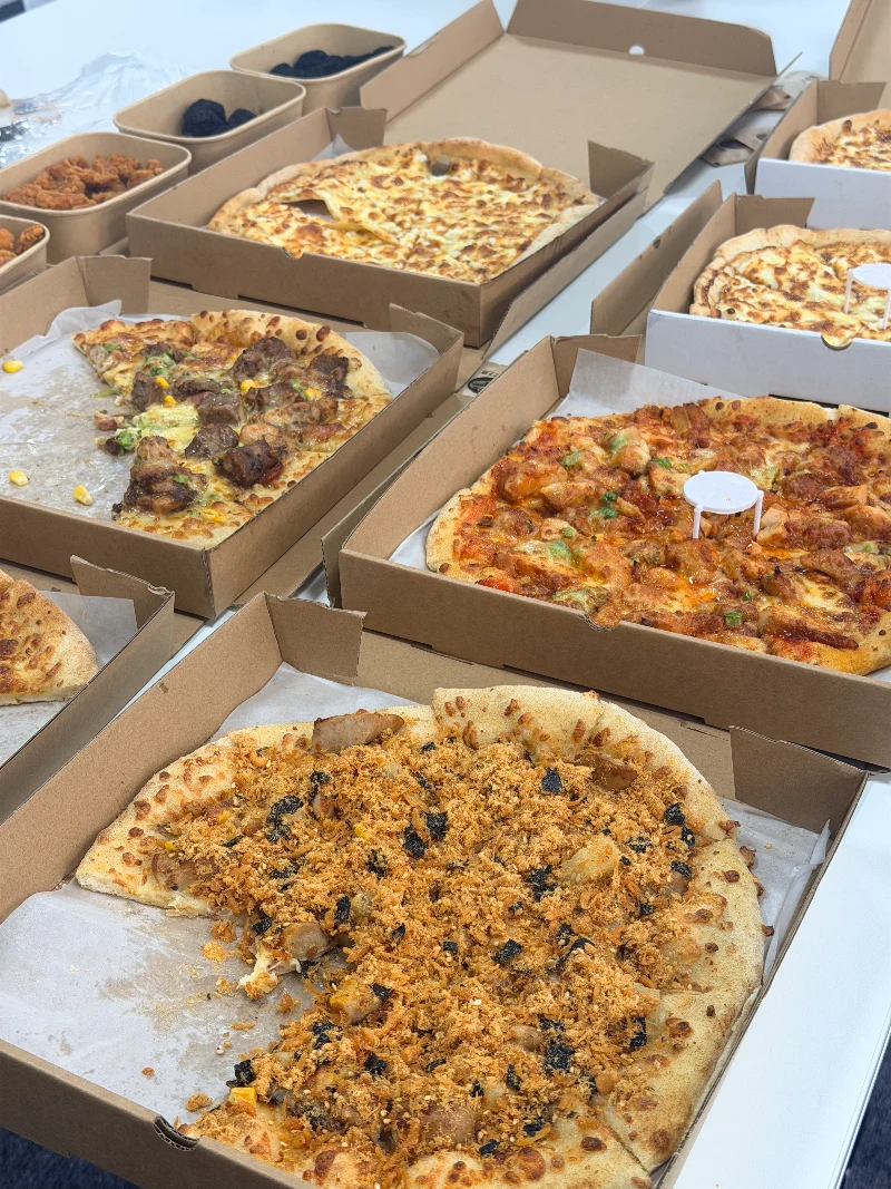 Generous chunks of black pepper beef, paired with sweet corn and fresh vegetables. The savory meat mixed with melted cheese – satisfying and energizing. The Orleans chicken pizza was just as good – tender, flavorful, and even non-veggie lovers went for seconds. It was the perfect fuel for a busy afternoon.